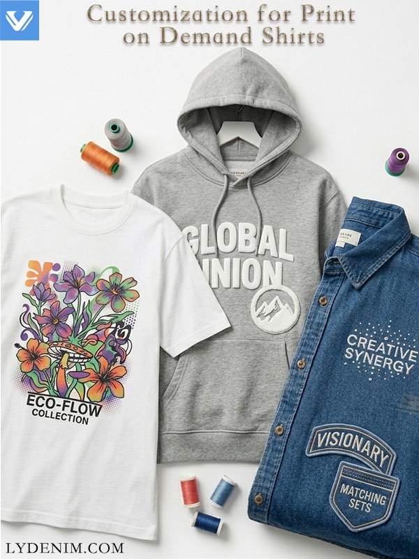 Print on Demand means producing garments only when ordered, eliminating large minimums and excess stock. This model shines for T-shirts (casual everyday wear), hoodies (cozy streetwear staples), and denim shirts or jackets (for structured, durable pieces with vintage appeal).