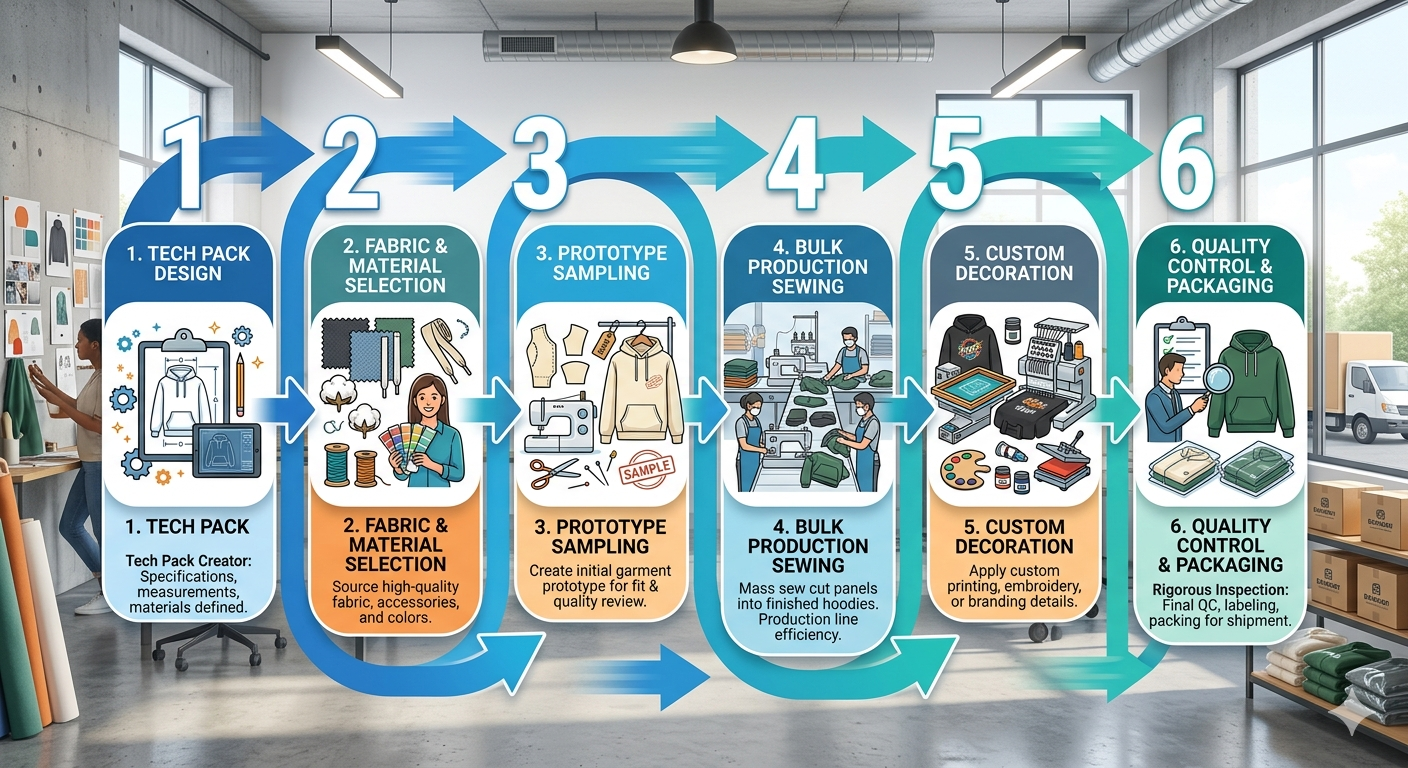 A reliable custom hoodie maker follows a structured end-to-end process to ensure consistency and quality: