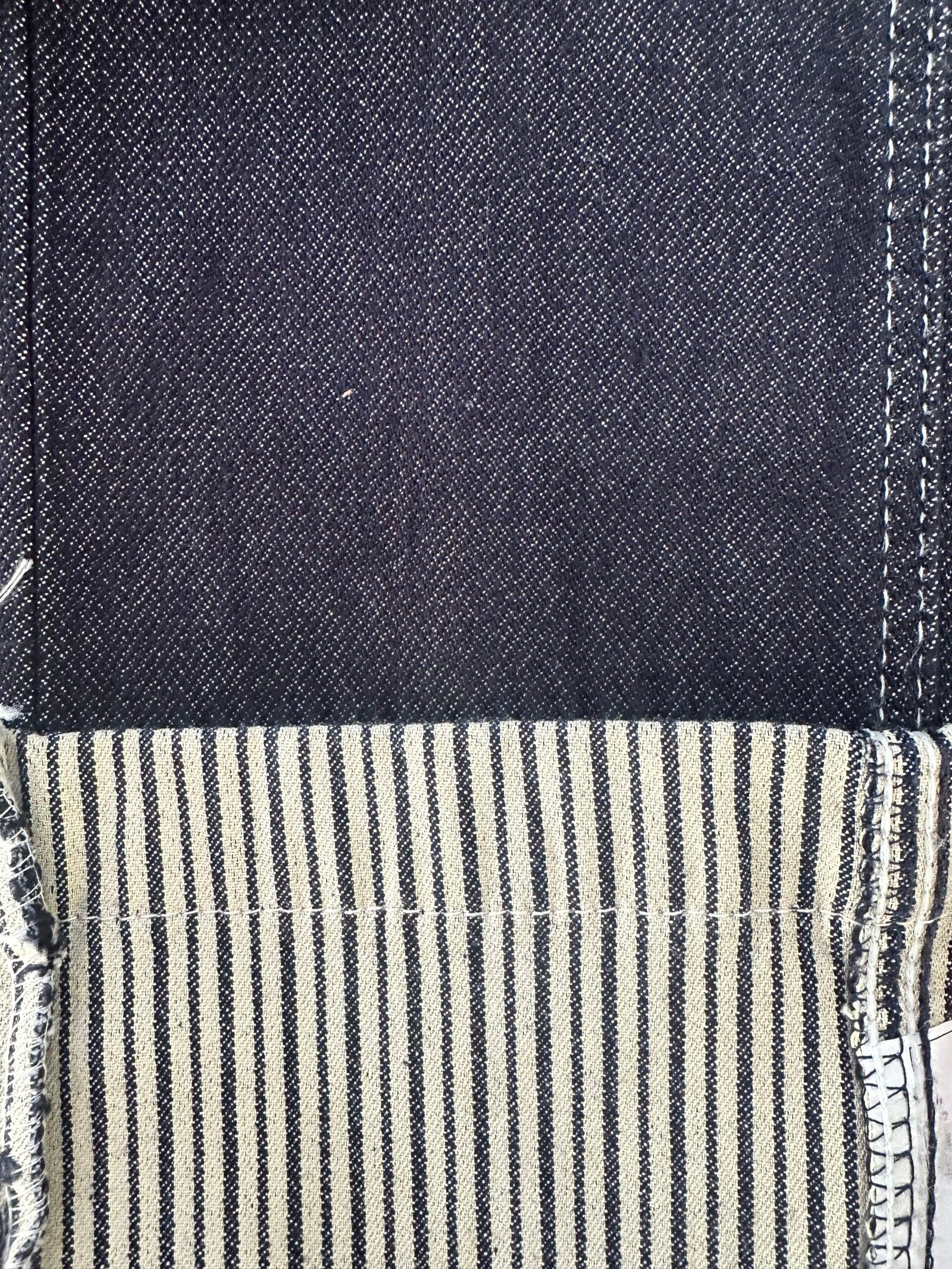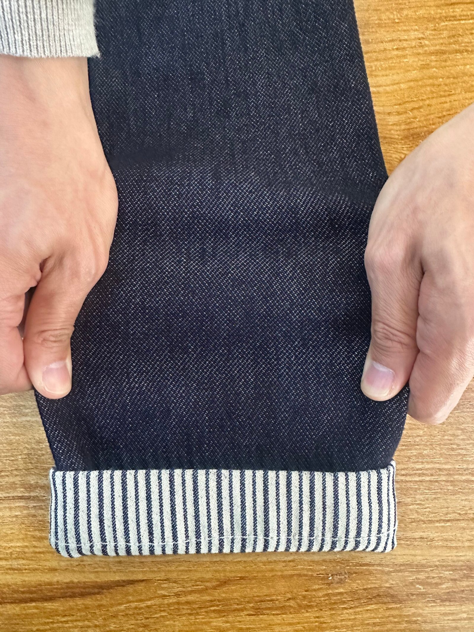 This is premium indigo denim upgraded in two big ways: advanced dyeing that locks color deep into the yarn, and a specialized vertical stripe weave on the reverse (bottom) side. Instead of the usual 3×1 or 4×1 twill, the weaving process uses varying yarn tensions and slight weft variations to create fine, natural parallel stripes visible only on the inside. The front stays clean and classic, but when you turn it inside out, those subtle stripes show up at seams, pockets, or cuffs—giving your jeans a quiet, premium edge.
