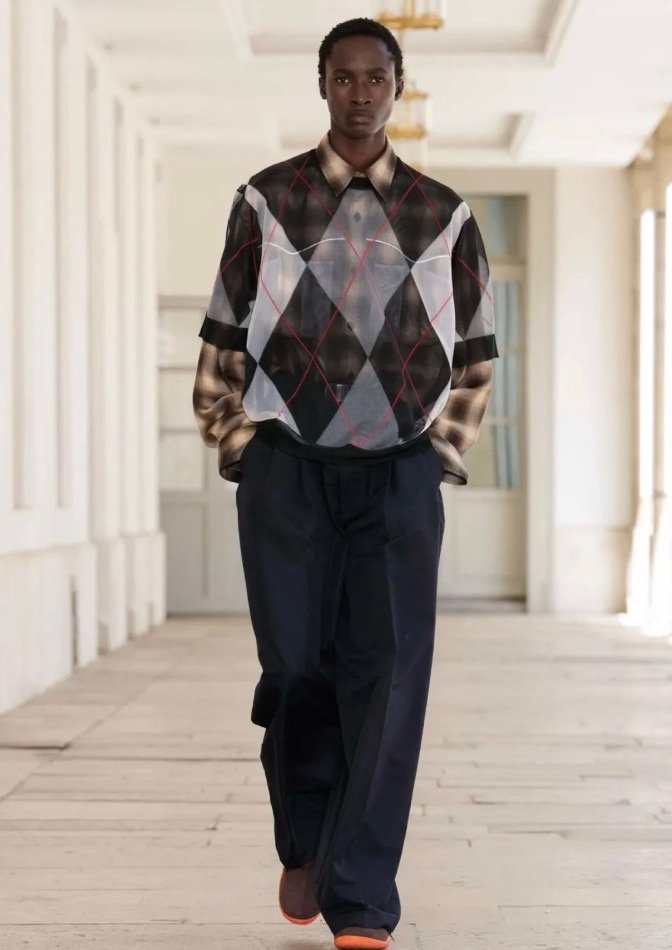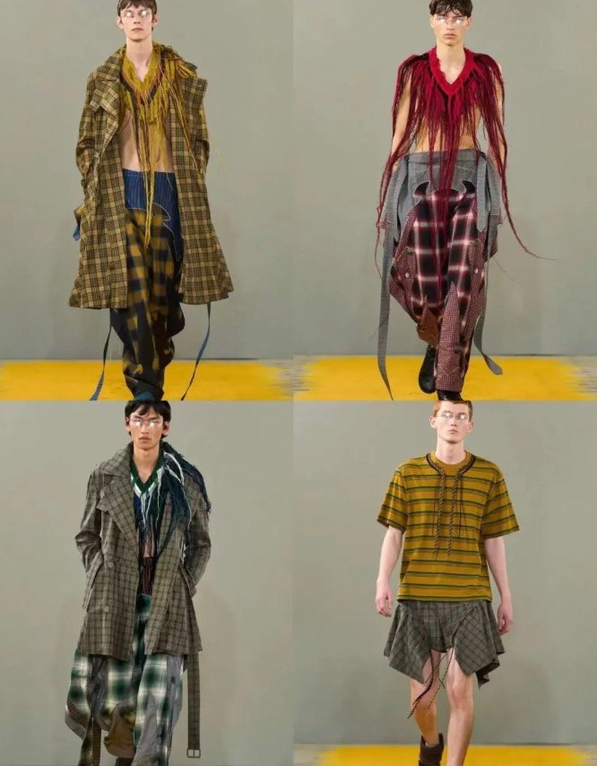 Kolor’s “Digital Tapestry” fractures plaids into color particles. Junichi Abe’s yarn blends of cotton, silk, and metallics shift hues in light; a slouchy suit jacket’s misaligned checks warp visually, while pants swap lines for gradient blocks mimicking pixel melts. 3D knits add relief, shattering plaid’s flatness like modeled grids.