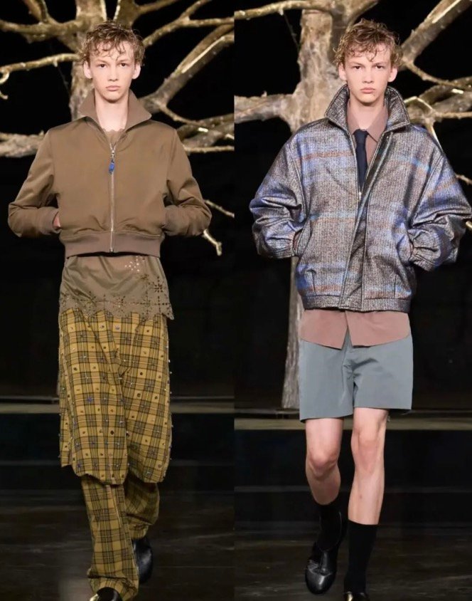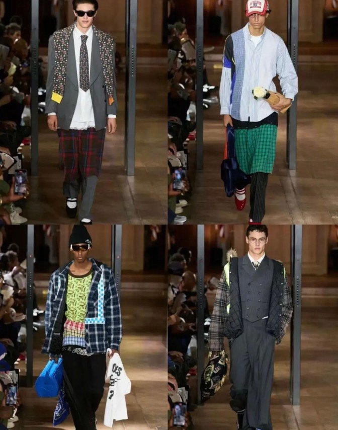 AWGE merges street culture with VR for “glitch plaid” revelry. Heat-transfer cracks simulate digital rips on classics; a denim jacket’s mirrored misprints double-expose errors. LED-wired fabrics flicker colors, blurring real-virtual lines—plaids as interactive fashion portals.