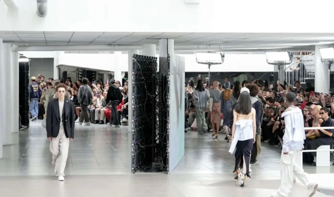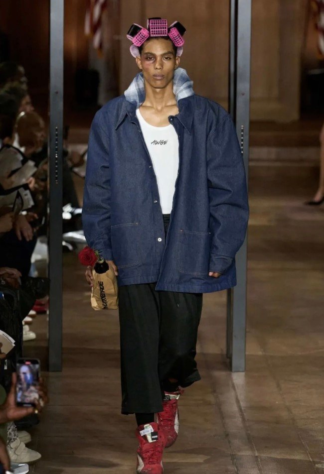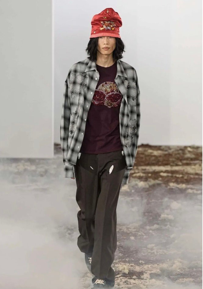 Kiko Kostadinov’s “CALIDITY” (heat + chill) theme mashes graffiti with futuristic utility. Silicone coatings and reflective materials make tags shift in light; a standout deconstructed work jacket sports glow-in-the-dark tech scrawls, like engineer annotations—functional yet flashy, signaling graffiti’s digital evolution.
