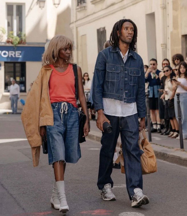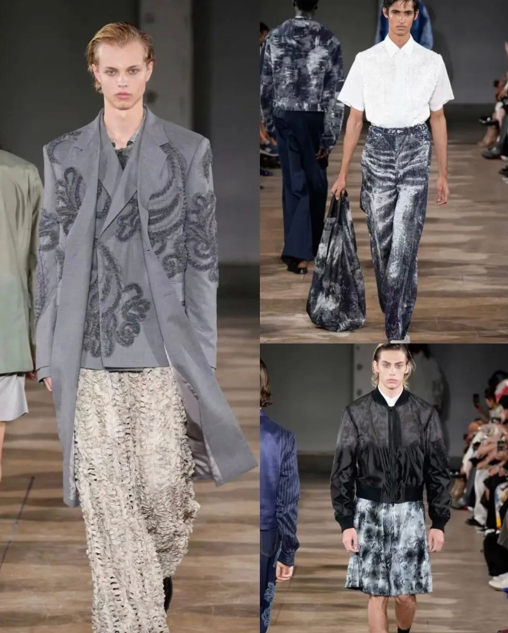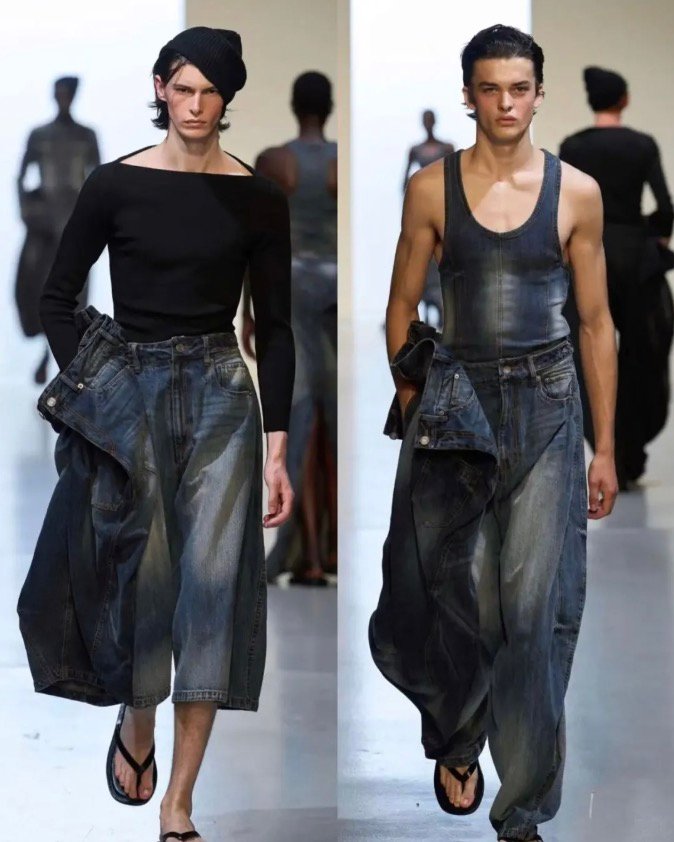 Denim sheds its workwear roots for faded washes, ripped voids, and hybrid patches (silk or lace splices) evoking breakage. Deconstruct into sheer overlays, linked by metal rings on intentional gaps—like relics unearthed from ruins, tendered by time’s polish. 2026 denim trends menswear lean slouchy and bold, with textured, cropped vibes for street fluidity.