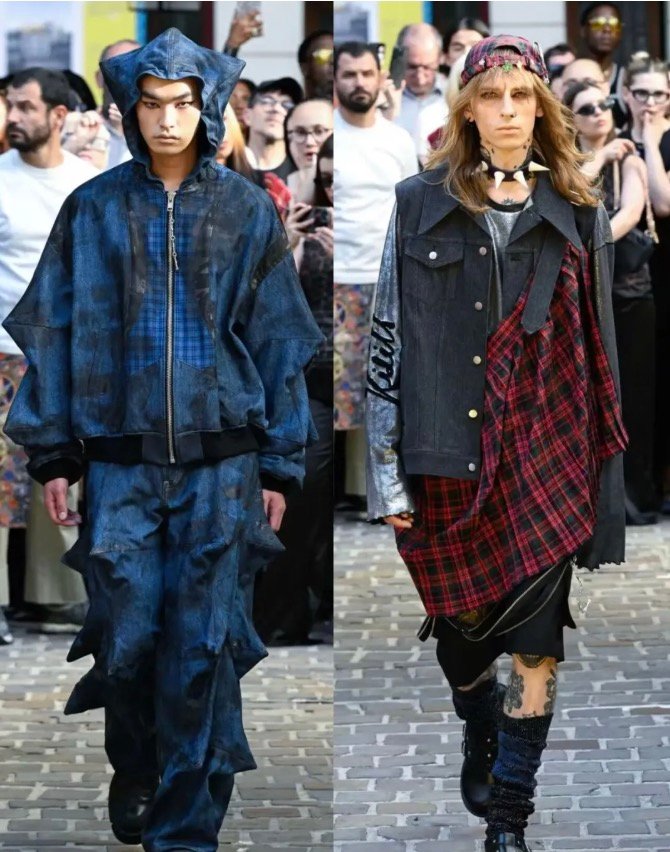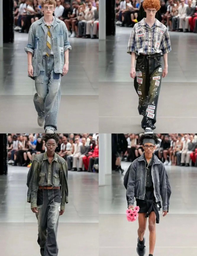 Camiel Fortgens’ “Archaeology” inspiration pushes denim to maximal fragmentation. Multi-wash distressing and raw edges mimic excavated artifacts; an asymmetric jacket splices faded canvas shoulders with back voids revealing indigo linings. Knitted crochet grids repair pant seams, celebrating damage while hinting at renewal—”tenderness in ruins.”