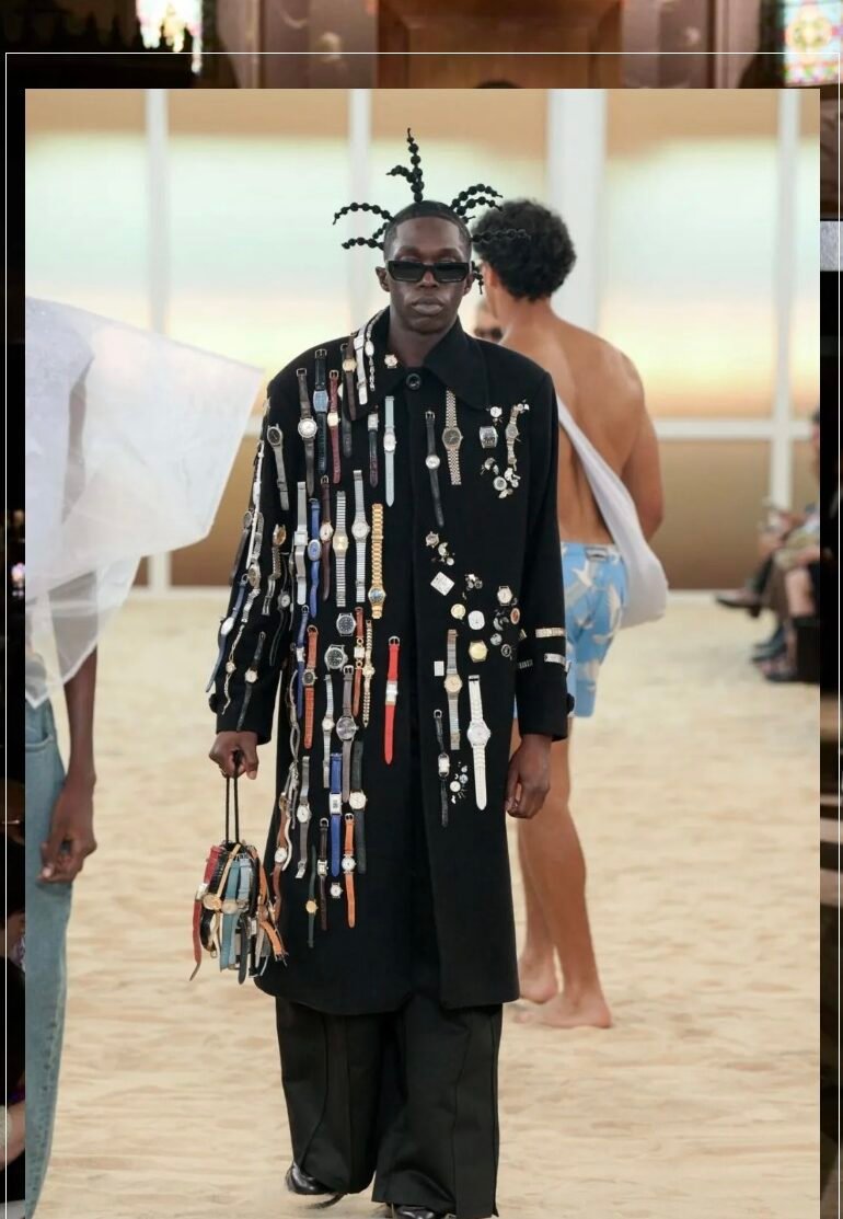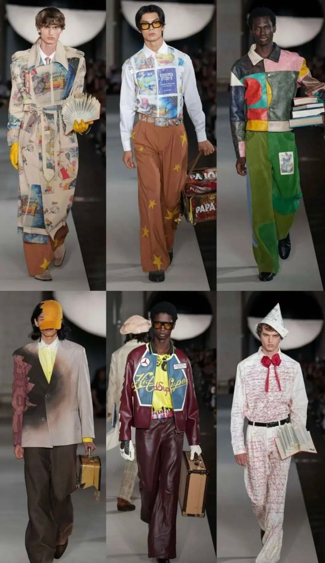 Kidsuper Studios unleashes a graffiti carnival, with Colm Dillane pulling from kids’ doodles to pair naive strokes with sophisticated cuts. Patterns mimic raw wall art—spontaneous and unpolished—adorning signature suit jackets in vivid chaos. Dillane extends the frenzy to accessories like scribbled sneakers and bags, delivering head-to-toe immersive storytelling.