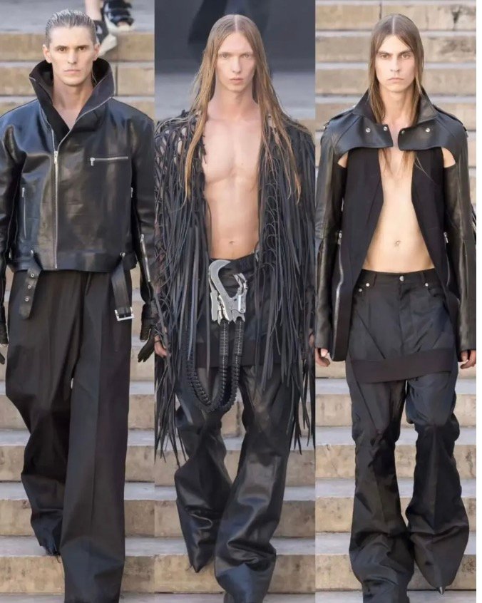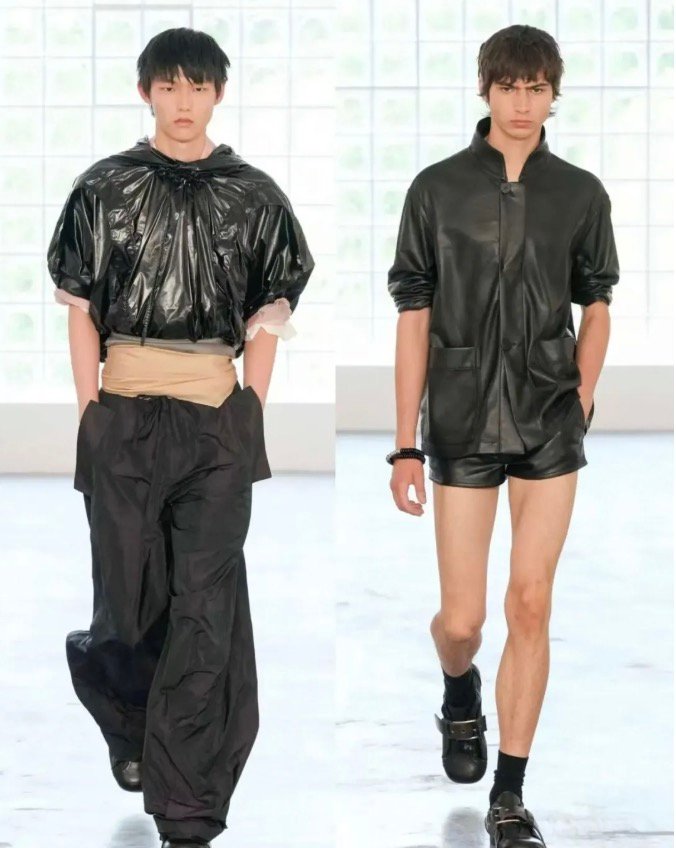 Rick Owens’ Paris-Tokyo Palace “aquatic rebirth” ritual softens goth-punk with rare fragility. Strap-laced sleeveless linen jackets conflict metal buttons and breathables; semi-sheer wide-legs splice leather armor like mid-molt creatures. Wet-runway staging clings fabrics to bodies, evolving punk from armor to exposure.