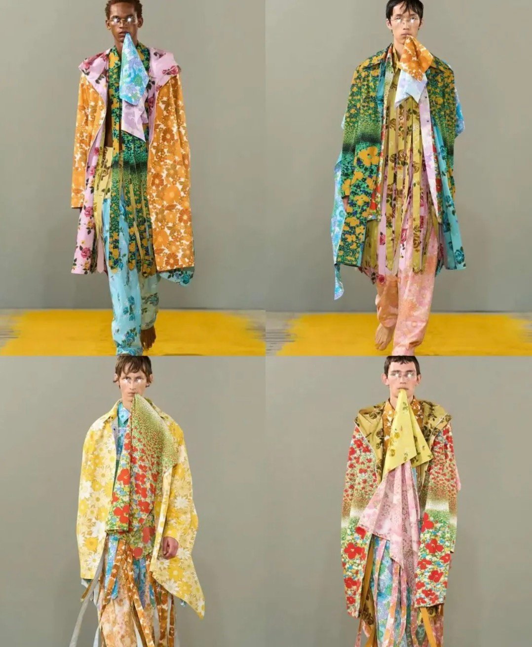 Craig Green’s “Shattered Guardians” turns plaids into symbolic armor via oversized prints and structural padding, sculpting shield-like coats. Fading and bleeding edges blur like low-res enlargements; plaid capes segmented by cross-straps evoke unpacked data, metaphorizing digital-era identity fragmentation and reassembly.
