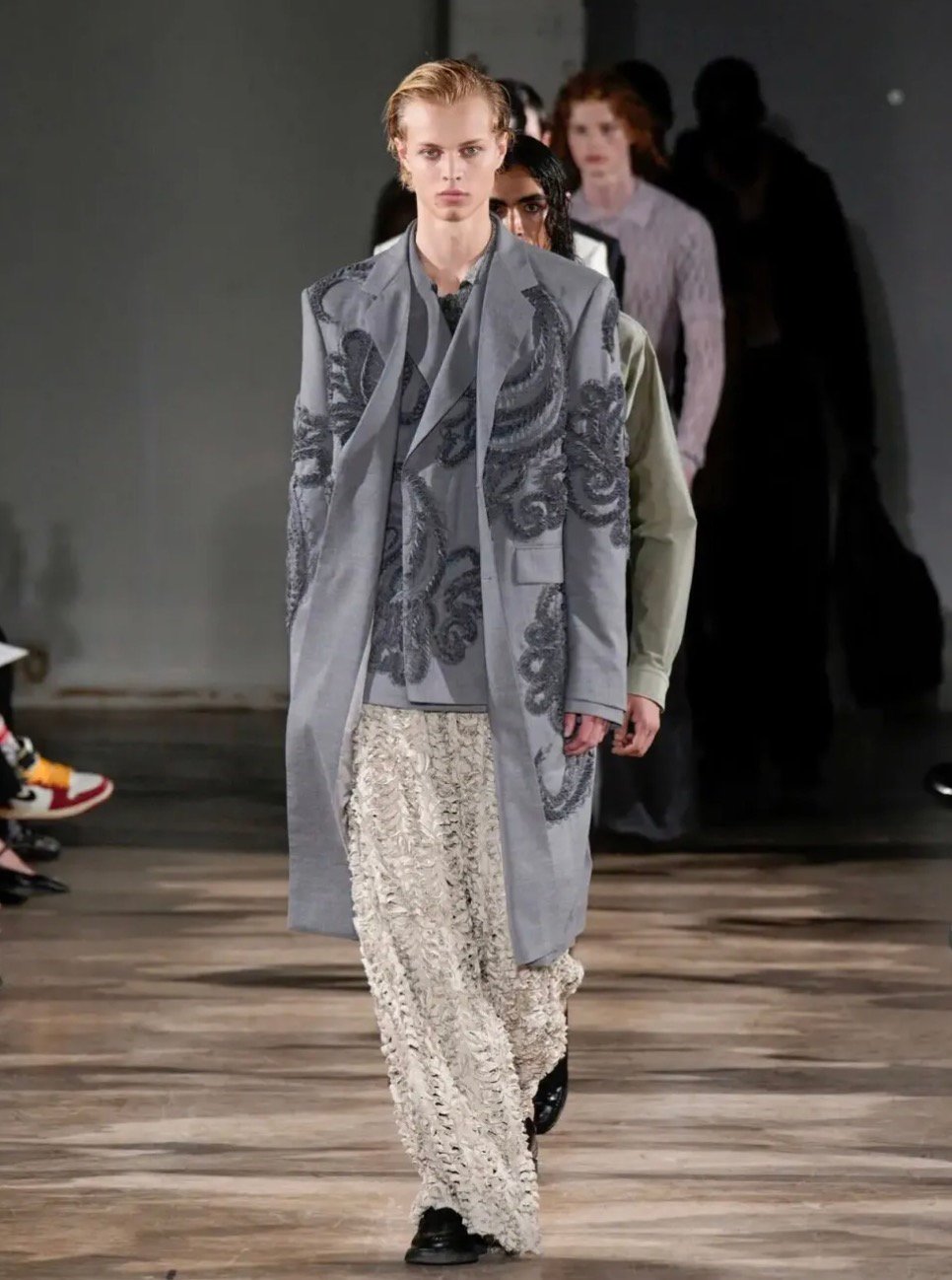 Juun.J’s military remix crafts “armored softness” in layered, padded denim coats with exaggerated shoulders and elbows, yet soft-washed for drape. A long duster’s silk lining contrasts laser-perforated exteriors for light play; detachable cargos and mesh vents blend destruction with utility, redrawing “luxury workwear.”